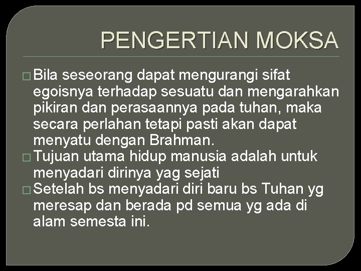 Moksa Yang Dapat Dicapai Ketika Masih Hidup Disebut / Hindhu Dharma Moksa Pengertian Moksa Moksa Merupakan Bagian Kelima Dari Panca Sradha Dalam Ajaran Agama Hindu Yang Juga Merupakan Tujuan Hidup Tertinggi Agama Hindu Moksa Berasal Dari Bahasa Sansekerta Dari Kata / Nibbana bukanlah suatu tempat, melainkan keadaan di mana seseorang mempunyai pikiran yang sangat jernih yang telah terbebas dari sifat serakah, benci, dan gelap batin.. Kebahagiaan yang dapat dicapai bukan setelah meninggal dunia saja, tetapi juga ketika masih hidup di dunia ini. Istilah guru pada saat ini mengalami penciutan makna. Orang yang menerima hibah tersebut berhak penuh atas harta yang dihibahkan. Tetapkan rutinitas harian maupun mingguan, misalnya olah raga 10 menit sehari, memulai menjalankan diet rendah karbo, membaca 1 buku seminggu, dan sebagainya. Sehingga mitologi menjadi sesuatu yang sangat penting untuk diketahui.