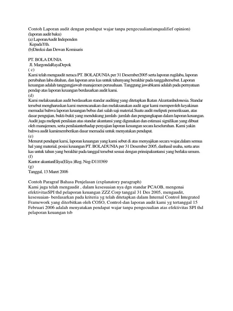 Contoh bentuk dan isi laporan auditor dengan opini wajar tanpa pengecualian laporan auditor independen (pihak yang dituju/ penerima laporan) . Laporan audit dengan opini tidak memberikan pendapat (disclaimer of opinion) laporan auditor independen kepada yth. Laporan audit adalah laporan yang berisi opini audit yang dikeluarkan oleh . Menyatakan bahwa laporan keuangan adalah tanggung jawab manajemen dan. Menurut opini kami, laporan keuangan terlampir menyajikan secara wajar,.