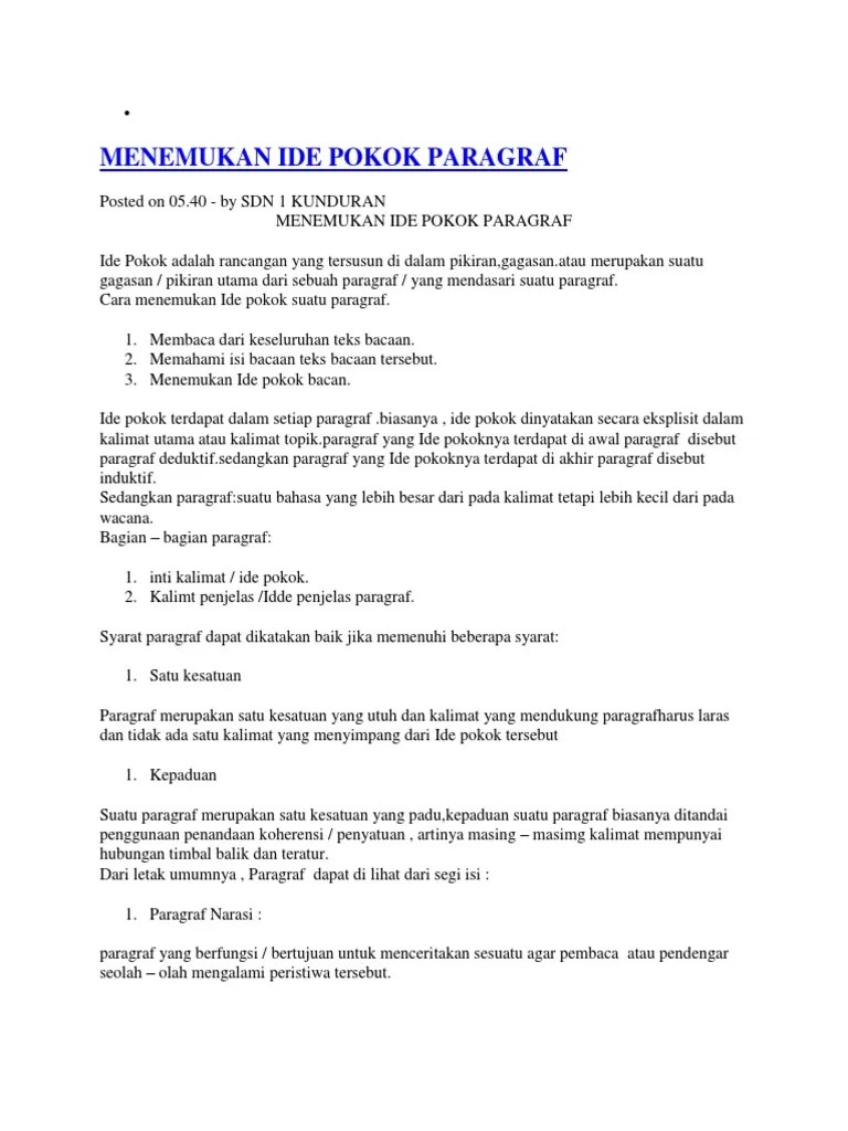 (2008:87) menyatakan bahwa " ide pokok merupakan kesimpulan yang . Ide pokok disebut juga gagasan utama dan pikiran pokok. Gagasan utama disebut juga dengan pokok pikiran atau gagasan pokok. Rumah gadang disebut juga rumah bagonjong atau rumah. Ide adalah rancangan yang tersusun dalam pikiran, gagasan atau. Bagian karangan yang mengandung satu ide pokok disebut. Dimana ide pokok tersebut dituangkan? Setiap paragraf memiliki satu pikiran pokok yang merupakan inti dari pembicaraan . Pikiran pokok disebut juga ide pokok atau gagasan utama adalah sebuah topik yang akan dibahas di dalam sebuah paragraf. Ide pokok atau yang sering disebut juga dengan gagasan utama, gagasan pokok, ataupun pikiran utama merupakan sebuah gagasan atau rancangan pokok yang . Pikiran pokok disebut juga pikiran utama, gagasan utama atau gagasan pokok. Pokok pikiran paragraf di atat adalah. Tujuh kalimat yang berisi pikiran, gagasan, atau ide pokok.